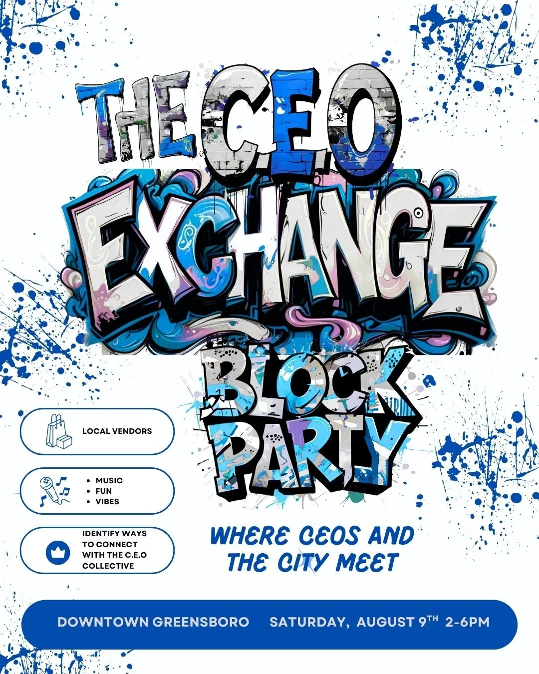 The CEO Exchange Block Party is your opportunity to be part of something bigger: This downtown celebration was curated to highlight the vision, hustle, and creativity of local entrepreneurs right in the heart of Greensboro. Whether you’re a vendor looking to expand your reach or a supporter who believes in shopping small and thinking big, this event is for you. Please share and tag your friends.